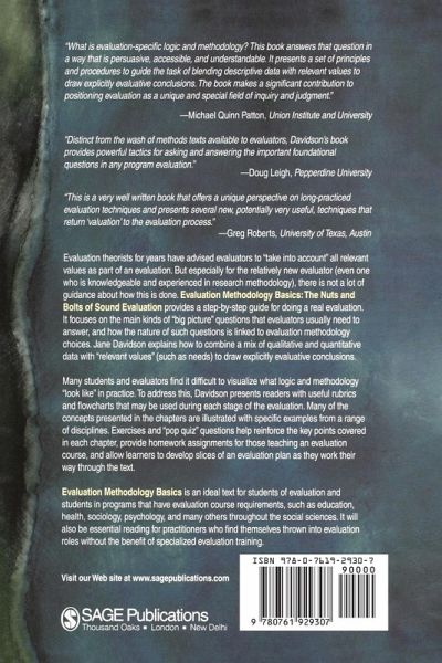 Evaluation Methodology Basics: The Nuts and Bolts of Sound Evaluation provides a step-by-step guide for doing a real evaluation. It focuses on the main kinds of "big picture" questions that evaluators usually need to answer, and how the nature of such questions is linked to evaluation methodology choices. Jane Davidson explains how to combine a mix of qualitative and quantitative data with "relevant values" (such as needs) to draw explicitly evaluative conclusions. The book presents readers with useful rubrics and flowcharts that may be used during each stage of the evaluation. Many of the concepts presented in the chapters are illustrated with specific examples from a range of disciplines. This book introduces evaluation by focusing on the main kinds of `big picture' questions that evaluations usually need to answer, and how the nature of such questions are linked to evaluation methodology choices. The author: shows how to identify the right criteria for your evaluation; discusses how to objectively figure out which criteria are more important than the others; and, delves into how to combine a mix of qualitative and quantitative data with `relevant values' (such as needs) to draw explicitly evaluative conclusions.