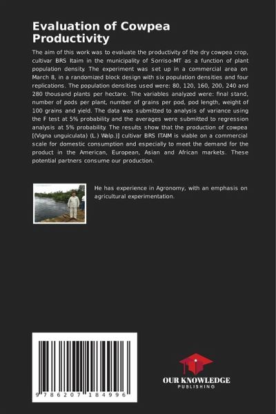 The aim of this work was to evaluate the productivity of the dry cowpea crop, cultivar BRS Itaim in the municipality of Sorriso-MT as a function of plant population density. The experiment was set up in a commercial area on March 8, in a randomized block design with six population densities and four replications. The population densities used were: 80, 120, 160, 200, 240 and 280 thousand plants per hectare. The variables analyzed were: final stand, number of pods per plant, number of grains per pod, pod length, weight of 100 grains and yield. The data was submitted to analysis of variance using the F test at 5% probability and the averages were submitted to regression analysis at 5% probability. The results show that the production of cowpea [(Vigna unguiculata) (L.) Walp.)] cultivar BRS ITAIM is viable on a commercial scale for domestic consumption and especially to meet the demand for the product in the American, European, Asian and African markets. These potential partners consume our production.