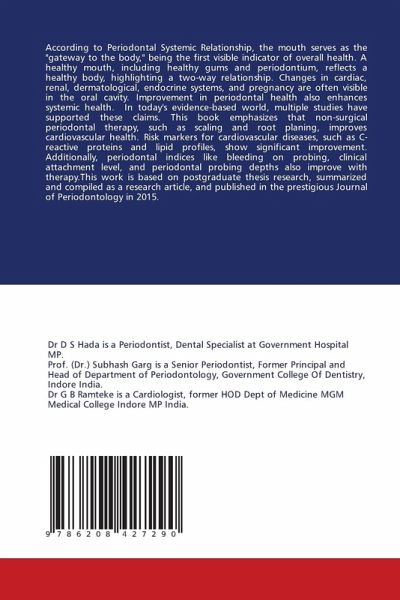 According to Periodontal Systemic Relationship, the mouth serves as the "gateway to the body," being the first visible indicator of overall health. A healthy mouth, including healthy gums and periodontium, reflects a healthy body, highlighting a two-way relationship. Changes in cardiac, renal, dermatological, endocrine systems, and pregnancy are often visible in the oral cavity. Improvement in periodontal health also enhances systemic health. In today's evidence-based world, multiple studies have supported these claims. This book emphasizes that non-surgical periodontal therapy, such as scaling and root planing, improves cardiovascular health. Risk markers for cardiovascular diseases, such as C-reactive proteins and lipid profiles, show significant improvement. Additionally, periodontal indices like bleeding on probing, clinical attachment level, and periodontal probing depths also improve with therapy.This work is based on postgraduate thesis research, summarized and compiled asa research article, and published in the prestigious Journal of Periodontology in 2015.