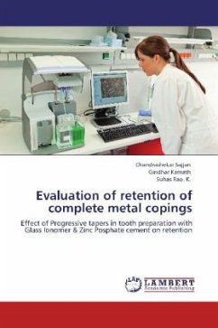 An in vitro study evaluated the retention of metal copings prepared with five different tapers and luted with two different cements. Eighty extracted human maxillary premolar teeth with measured dimensions & sound surfaces were selected for the study.crown preparations were done using a high speed hand piece which was stabilized by a specially fabricated customized holding device that can be moved in horizontal plane to obtain the desired degree of taper for the preparation. The crown preparation with different tapers 0, 3, 6, 9& 12 degrees respectively were achieved. Die Preparation, wax pattern fabrication, investing the wax pattern & casting procedures were carried out & metal copings were luted with glass ionomer cement and zinc phosphate cement.The breaking load was recorded when the metal coping got separated from the tooth. The force at failure was recorded in kilograms and it was concluded that the use of glass ionomer cement did not result in increased retentive strengthover zinc phosphate cement,choice of cement for crowns prepared within this ideal range (3-6 degree taper) might be of limited clinical significance& 50% reduction in retention with 12 degree taper.