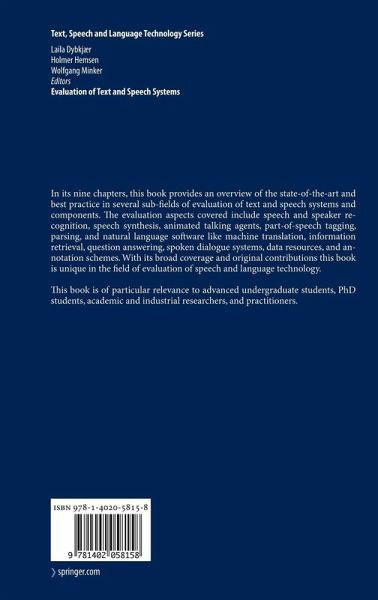In its nine chapters, this book provides an overview of the state-of-the-art and best practice in several sub-fields of evaluation of text and speech systems and components. The evaluation aspects covered include speech and speaker recognition, speech synthesis, animated talking agents, part-of-speech tagging, parsing, and natural language software like machine translation, information retrieval, question answering, spoken dialogue systems, data resources, and annotation schemes. With its broad coverage and original contributions this book is unique in the field of evaluation of speech and language technology.