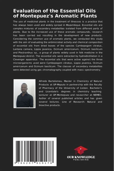 The use of medicinal plants in the treatment of illnesses is a practice that has always been used and widely spread in Mozambique. Essential oils are complex mixtures of secondary metabolites isolated from different parts of plants. Due to the increased use of these aromatic compounds, research has been carried out resulting in the development of new products. Considering the common use of aromatic plants, we conducted this study with the aim of evaluating the antimicrobial activity and chemical composition of essential oils from dried leaves of the species Cymbopogom citratus, Lantana camara, Lippia javanica, Ocimum americanum, Ocimum basilicum and Plectranthus sp., a group of plants widely used in folk medicine in the Montepuez district. The essential oils were extracted by hydrodistillation in a Clevenger apparatus. The essential oils that were active against the three microorganisms used were Cymbopogom citratus, Lippia javanica, Ocimum americanum and Ocimum basilicum. The classes of secondary metabolites were detected using gas chromatography coupled with mass spectrometry.