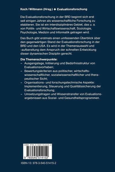 I. Einführung und Übersicht.- 1. Statt einer Einleitung: Die Tagung "Evaluation: Bewertungsgrundlage von Sozial- und Gesundheitsprogrammen".- 2. Aufgaben und Möglichkeiten der Evaluationsforschung in der Bundesrepublik Deutschland - Technologietransfer aus den Sozialwissenschaften.- 3. Theorien der Programmevaluation - Ein kurzer Abriß.- 4. Kosten vs. Versorgung: Amerikas Gesundheitsversorgungsdilemma wird falsch eingeschätzt.- II. Ausgangslage, Initiierung und Bedürfnisstruktur von Evaluationsvorhaben.- 5. Evaluationsbedarf innerhalb des Regierungssystems.- 6. Erfahrungen bei der Anregung und Übernahme von Evaluationsvorhaben - Die Sicht des Evaluationsforschers.- 7. Bedarf an Evaluationsforschung im Bereich der medizinischen Rehabilitation aus der Sicht der Rentenversicherungsträger.- 8. Mißbrauch sozialer Dienstleistungen - Professionalisierungs- und entscheidungstheoretische Korrekturen einer weit verbreiteten Ansicht.- III. Bewertungskriterien aus politischer, wirtschaftswissenschaftlicher, sozialwissenschaftlicher und therapeutischer Sicht.- 9. Operationalisierung komplexer Bewertungskriterien am Beispiel der Frühberentung.- 10. Empirische Kriteriumsanalyse am Beispiel der Evaluation eines Modellversuchs zur ärztlichen Gesundheitsberatung.- 11. Bewertung einer psychosomatischen Fachklinik auf der Basis sozial- und wirtschaftswissenschaftlicher Kriterien.- 12. Multiple Bewertungskriterien innerhalb des Modells "Psychosoziales Anschlußprogramm".- IV. Organisations- und forschungsstrategische Aspekte: Implementierung, Steuerung und Qualitätssicherung der Evaluationsforschung.- 13. Amerikanische Erfahrungen mit der Evaluation von Sozial- und Gesundheitsprogrammen.- 14. Die Leiden der Evaluation - Implementierung, Qualitätssicherung undAussagemöglichkeiten von Evaluationsvorhaben vor dem Hintergrund der ERS-Standards.- 15. Impuls der Prozeßevaluation auf die ärztliche Versorgung.- 16. Forschungsstrategien im Bereich der medizinischen Rehabilitation und Frühberentung - Sozialepidemiologische Analysen auf der Basis von Routinedaten der Rentenversicherung.- 17. Die Aussagekraft von Ex-ante-Evaluationen am Beispiel der Wirkung von Früherkennungsmaßnahmen auf Herz- und Kreislaufkrankheiten.- V. Umsetzungsfragen und Wissenstransfer von Evaluationsergebnissen aus Sozial- und Gesundheitsprogrammen.- 18. Die gemeindenahe Begleitforschung der Deutschen Herz-Kreislauf-Präventionsstudie (DHP).- 19. Evaluation und Politik. Die Umsetzung von Evaluationsergebnissen in exekutiven und legislativen Bundesorganen der USA.- 20. Organisation und Umsetzung von Bundesprogrammen unter evaluativen Aspekten - am Beispiel des Modellprogramms zur Reform der Versorgung im psychiatrischen und psychotherapeutisch/psychosomatischen Bereich.- 21. Umsetzungsprobleme am Beispiel eines Modellversuchs zur Steigerung der Inanspruchnahme von Früherkennungsuntersuchungen.- 22. Probleme bei der Umsetzung sozialpsychiatrischer Modellvorhaben (Modellverbund "Psychiatrie" des BMJFFG).- VI. Resümee.- 23. Einige Forderungen für die Weiterentwicklung der Evaluationsforschung in der Bundesrepublik Deutschland.- Anhang: Standards der Evaluation Research Society.