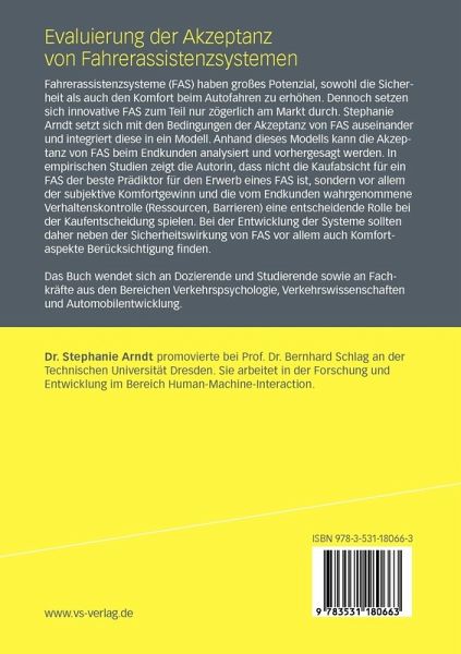 Fahrerassistenzsysteme (FAS) haben großes Potenzial, sowohl die Sicherheit als auch den Komfort beim Autofahren zu erhöhen. Dennoch setzen sich innovative FAS zum Teil nur zögerlich am Markt durch. Stephanie Arndt setzt sich mit den Bedingungen der Akzeptanz von FAS auseinander und integriert diese in ein Modell. Anhand dieses Modells kann die Akzeptanz von FAS beim Endkunden analysiert und vorhergesagt werden. In empirischen Studien zeigt die Autorin, dass nicht die Kaufabsicht für ein FAS der beste Prädiktor für den Erwerb eines FAS ist, sondern vor allem der subjektive Komfortgewinn und die vom Endkunden wahrgenommene Verhaltenskontrolle (Ressourcen, Barrieren) eine entscheidende Rolle bei der Kaufentscheidung spielen. Bei der Entwicklung der Systeme sollten daher neben der Sicherheitswirkung von FAS vor allem auch Komfortaspekte Berücksichtigung finden.
