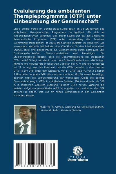 Diese Studie wurde im Bundesstaat Südkordofan an 33 Standorten des ambulanten therapeutischen Programms durchgeführt, die sich an verschiedenen Orten befanden. Ziel dieser Studie war es, das ambulante therapeutische Programm (OTP) unter Verwendung des Ansatzes "Community Management of Acute Malnutrition (CMAM)" zu bewerten. Die verwendete Methodik beinhaltete eine Checkliste für den Inhaltsstandard, SQUEAC-Tools und Beobachtung zur Datenerhebung durch Befragung von Ernährungsfachkräften, Gemeindearbeitern und Freiwilligen. Die Studienergebnisse zeigten, dass die Gesamtabdeckung bei städtischen OTPs bei 60 % liegt und damit unter dem Sphere-Standard von >70 % liegt. Während die Heilungsrate in ländlichen Gebieten bei 77 % und die Ausfallrate bei 21 % liegt, war das Personal, das die OTPs betreibt, in den meisten OTPs (5 pro OTP) unter dem Standard, nur 17 OTPs (51,5 %) von 3 3 haben 5 Mitarbeiter in jedem OTP, die meisten von ihnen (81 %) waren Freiwillige, dennoch hebt die Schlussfolgerung der wichtigsten Punkte die geringe Gesamtabdeckung in OTPs in städtischen Gebieten (60 %) und mehr als 100 % in ländlichen Gebieten aufgrund falscher Ziele hervor. Während die meisten aufgenommenen Kinder (48,9 %) angaben, sich selbst an das OTP gewandt zu haben, was auf ein hohes Bewusstsein in den Gemeinden hindeuten könnte.