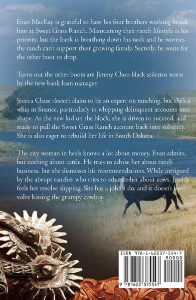 Evan MacKay is grateful to have his four brothers working beside him at Sweet Grass Ranch. Maintaining their ranch lifestyle is his priority, but the bank is breathing down his neck and he worries the ranch can't support their growing family. Secretly, he waits for the other boot to drop. Turns out the other boots are Jimmy Choo black stilettos worn by the new bank loan manager. Jessica Chase doesn't claim to be an expert on ranching, but she's a whiz in finance, particularly in whipping delinquent accounts into shape. As the new kid on the block, she is driven to succeed, and ready to pull the Sweet Grass Ranch account back into solvency. She is also eager to rebuild her life in South Dakota. The city woman in heels knows a lot about money, Evan admits, but nothing about cattle. He tries to advise her about ranch business, but she dismisses his recommendations. While intrigued by the abrupt rancher who tries to educate her about cows, Jessica feels her resolve slipping. She has a job to do, and it doesn't involve kissing the grumpy cowboy. But kiss him, she does. Can Jessica rein in her growing attraction for Evan while remaining committed to her professional goal? Will love triumph over the bottom line?