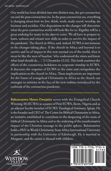 Our world has been divided into two distinct eras, the pre-coronavirus era and the post-coronavirus era. In the post-coronavirus era, everything is changing about how we live, think, work, study, travel, worship, do business and socialize. Our dispositions to the changes will determine what the post-coronavirus world will look like for us. Rigidity will be a great undoing for many in the days to come. We all have to prepare to learn, unlearn and relearn new skills in order to survive the impact of the pandemic. The church in Africa, and, indeed, ECWA is not immune to the changes taking place. If the church in Africa and beyond is to survive and be of impact in this new-normal era of the world, then it must be like the men of Issachar, 'who understood the times and knew what Israel should do . . .' (1 Chronicles 12:32). This book examines the effects of the coronavirus lockdown on corporate worship in ECWA. It discusses the response of ECWA to the same and extrapolates the implications to the church in Africa. These implications are important for the future of evangelical Christianity in Africa so the church can strategise to minister in the face of the new realities introduced by the outbreak of the coronavirus pandemic.