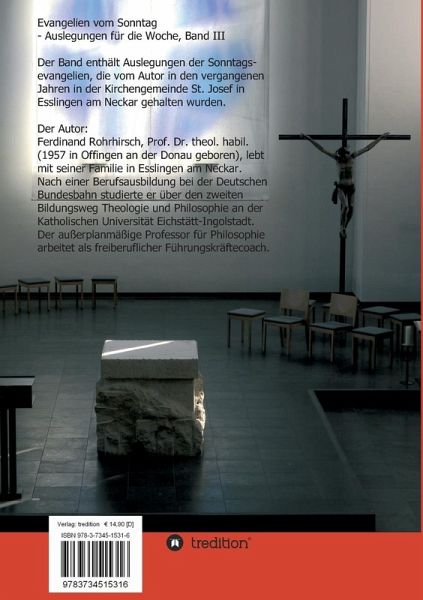 Der Band enthält Auslegungen der Sonntagsevangelien, die vom Autor in den vergangenen Jahren in der Kirchengemeinde St. Josef in Esslingen am Neckar gehalten wurden.Neben den Auslegungen ist auch das betreffende Evangelium des Sonntags abgedruckt.Die Auslegungen ziehen das Evangelium in die Gegenwart. Sie sprechen keine Helden des Glaubens an, sondern sind für die Menschen gedacht, die mit ihren Zweifeln und Nöten den Alltag nicht nur im Geist Jesu Christi ertragen, sondern auch aus seinem Geist heraus, in Freude und Hoffnung, gestalten wollen.Die Auslegungen eignen sich sowohl für eine Abendreflexion, wie auch für eine meditative Pause, mitten im Alltag.
