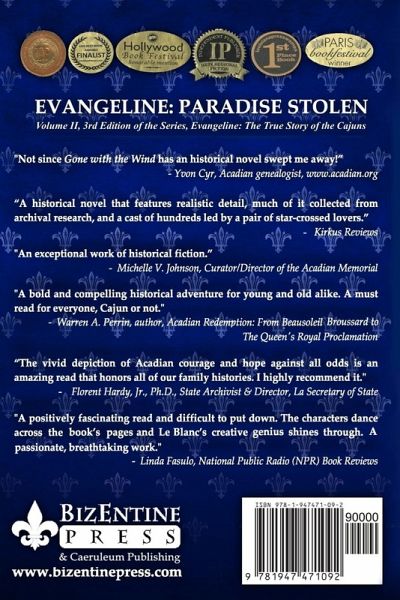 This 6-time award-winning trilogy of historical fiction is based on the true story of French nobility and commoners who settled in French New World territory of Acadia, which later became British-ruled Nova Scotia, and the engaged couple torn apart just before their wedding who must search the world for each other to realize their destiny. The author based this saga on her ancestors which she traced to 9th century France, and she used her genealogical records and oral family histories to weave history, political intrigue, mystery, and international adventure with historical personages and fictional characters. The story of Evangeline was written in 1847 as a tragedy by Henry Wadsworth Longfellow, but this story sets the record straight as to what actually happened, using period diaries, letters and other archival materials as the basis for dialogue and action among the heroes, heroines and villains of this must-read trilogy. Before Jamestown, the Pilgrims, and the American Colonies, came the New World settlement of Acadia by France in 1604. The Acadian town of Grand Pré is an insulated world of beautiful trees abundant harvests and affluent French residents at peace with their world and their allies, the Mi'Kmaq First Nation. Star-crossed lovers, Evangeline Le Blanc de Verdure and Gabriel Mius d'Entremont are to be married hen two events change their lives forever -- a British officer is found dead but Evangeline must say nothing to protect her honor; and Evangeline's fiancé Gabriel and father Lord René, Royal Consul to French King Louis XV, are imprisoned for "treason" as resistance leaders against the British. Their idyllic life begins to crumble around them when in 1755, violating a peace treaty between England and France, British King George II issues an Edict to deport the Acadians forever by separating families and forcing them into animal cargo ships bound for destinations unknown in the New World, Europe and the Caribbean. Evangeline's innocence shattered, she must choose between life without her love or possible death for defying British orders. Evangeline and Gabriel and their families are at risk in a game of political intrigue, murder and espionage set against the glamour and adventure of 18th century Versailles, London and Acadia. Will their courage, faith and passion overcome threats to their very survival, or will they find their paradise stolen?