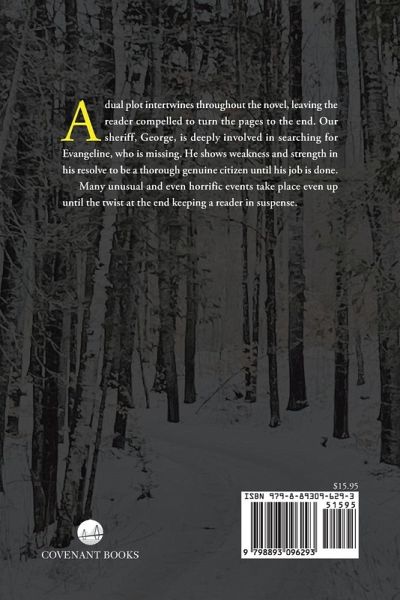 A dual plot intertwines throughout the novel, leaving the reader compelled to turn the pages to the end. Our sheriff, George, is deeply involved in searching for Evangeline, who is missing. He shows weakness and strength in his resolve to be a thorough genuine citizen until his job is done. Many unusual and even horrific events take place even up until the twist at the end keeping a reader in suspense.