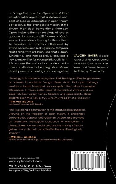 Description: In Evangelism and the Openness of God, Vaughn Baker argues that a dynamic concept of God as articulated in open theism better serves the evangelistic mission of the church than does conventional theology. Open theism affirms an ontology of love as opposed to power, and it focuses on God's kenosis in creation, allowing for the authentic freedom of creation influenced by divine persuasion. God's genuine temporal relationship with creation--one that is open, synergist, and non-coercive--provides a new perspective for evangelistic activity. In this volume the author has made a valuable contribution to the integration of new developments in theology and evangelism. Endorsements: ""Theology truly matters to evangelism. Bad theology muffles the good news or confuses its audience. Vaughn Baker shows that open theology provides a better framework for evangelism than other theological alternatives. It makes better sense of the biblical witness and our deep intuitions about human freedom and responsibility. Baker presents open theology as truly winsome theology of evangelism."" --Thomas Jay Oord, Northwest Nazarene University ""This is a splendid contribution to the literature on evangelism. Drawing on the theology of open theism, it challenges conventional, populist (and Calvinist) wisdom and provides an alternative, theological foundation for evangelism. It also explores how we should practice the ministry of evangelism in ways that will be both effective and theologically salutary."" --William J. Abraham, Perkins School of Theology, Southern Methodist University About the Contributor(s): Vaughn Baker is Lead Pastor of Silver Creek United Methodist Church in Azle, Texas, and Senior Fellow of the Polycarp Community.