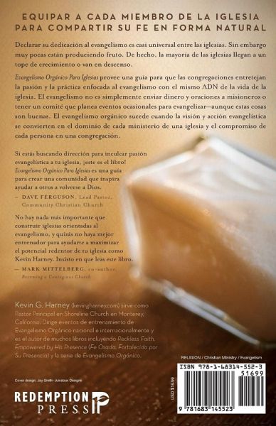 EQUIPAR A CADA MIEMBRO DE LA IGLESIA PARA COMPARTIR SU FE EN FORMA NATURAL Declarar su dedicación al evangelismo es casi universal entre las iglesias. Sin embargo tan pocas están produciendo fruto. De hecho, la mayoría de las iglesias llegan a un tope de crecimiento o van en descenso. Evangelismo Orgánico Para Iglesias provee una guía para que las congregaciones entretejan la pasión y la práctica enfocada al evangelismo en el mismo ADN de la vida de la iglesia. El evangelismo no es simplemente enviar dinero y oraciones a misioneros o tener un comité que planea eventos ocasionales para evangelizar—aunque estas cosas son buenas. El evangelismo orgánico sucede cuando la visión y acción evangelística se convierten en el dominio de cada ministerio de una iglesia y el compromiso de cada persona en una congregación. Si estás buscando dirección para inculcar pasión evangelística a tu iglesia, ¡este es el libro! Evangelismo Orgánico Para Iglesias es una guía para crear una comunidad que aspira ayudar a otros a volverse a Dios. – Dave Ferguson, Pastor Principal, Community Christian Church No hay nada más importante que construir iglesias orientadas al evangelismo, y quizás no haya mejor entrenador para ayudarte a maximizar el potencial redentor de tu iglesia como Kevin Harney. Insisto en que leas este libro. – Mark Mittelberg, co-autor, Becoming a Contagious Church