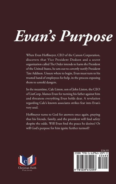 When Evan Hoffmeyer, CEO of the Carson Corporation, discovers that Vice President Dodson and a secret organization called The Order intends to harm the President of the United States, he sets out to covertly notify President Tate Addison. Unsure where to begin, Evan must turn to his trusted band of employees for help, in the process exposing them to untold dangers. In the meantime, Cale Liston, son of John Liston, the CEO of ListCorp, blames Evan for turning his father against him and threatens everything Evan holds dear. A revelation regarding Cale's known associates strikes fear into Evan's very soul. Hoffmeyer turns to God for answers once again, praying that his friends, family, and the president will find safety despite the odds. Will Evan find the peace he desires? Or will God's purpose for him ignite further turmoil?