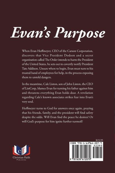 When Evan Hoffmeyer, CEO of the Carson Corporation, discovers that Vice President Dodson and a secret organization called The Order intends to harm the President of the United States, he sets out to covertly notify President Tate Addison. Unsure where to begin, Evan must turn to his trusted band of employees for help, in the process exposing them to untold dangers. In the meantime, Cale Liston, son of John Liston, the CEO of ListCorp, blames Evan for turning his father against him and threatens everything Evan holds dear. A revelation regarding Cale's known associates strikes fear into Evan's very soul. Hoffmeyer turns to God for answers once again, praying that his friends, family, and the president will find safety despite the odds. Will Evan find the peace he desires? Or will God's purpose for him ignite further turmoil?