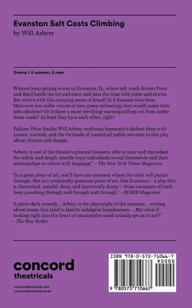 Winters keep getting worse in Evanston, IL, where salt truck drivers Peter and Basil battle the ice and snow and pass the time with jokes and stories. But what's with this creeping sense of dread? Is it because their boss Maiworm has noble visions of new green technology that would make their jobs obsolete? Or is there a more terrifying warning calling out from under these roads? At least they have each other, right? Pulitzer Prize finalist Will Arbery confronts humanity's darkest fears with humor, warmth, and the fortitude of municipal public servants in this play about climate and change. "Arbery is one of the theater's greatest listeners, able to hear and reproduce the subtle and deeply specific ways individuals reveal themselves and their relationships to others with language." - The New York Times Magazine "In a great piece of art, you'll have one moment where the truth will punch through. But in a profoundly generous piece of art, like Evanston - a play that is theoretical, painful, deep, and hysterically funny - those moments of truth keep punching through and through and through." - BOMB Magazine "A pitch-dark comedy... Arbery is the playwright of the moment... writing about issues that tend to lead to indulgent hopelessness. ...But what if looking right into the heart of catastrophe could actually get us to act?" - The New Yorker