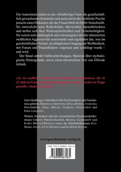 Die Autorinnen entlarven die »friedfertige Frau« als gesellschaftlich gewachsenes Konstrukt und analysieren die weibliche Psyche jenseits eines Diskurses, der die Frauen bloß als Opfer festschreibt. Sie entwickeln neue Rollenbilder, überwinden Sprachklischees und stellen sich ihrer Widersprüchlichkeit und Vielschichtigkeit. Sie setzen sich eindringlich und schonungslos mit der tabuisierten weiblichen Aggressivität auseinander und ergründen das, was im geschichtlichen Verlauf, im alltäglichen Umgang mit Weiblichkeit, mit Frauen und Frauenbildern vergessen und verdrängt wurde - und wird. Der Band enthält Fallbeschreibungen, Material über mythologische Hintergründe sowie einen literarischen Text von Elfriede Jelinek. »Es ist endlich soweit: Die ideologischen Hemmnisse, die in 25 Jahren Frauenbewegung angehäuft wurden, werden in Frage gestellt.« Isabelle Azoulay Zum Hamburger Arbeitskreis für Psychoanalyse und Feminismus gehören Martina Christlieb, Sonja Düring, Angelika Holderberg, Erika Mielke, Gabriele Teckentrup und Edda Uhlmann. Weitere Autorinnen sind die renommierten Psychoanalytikerinnen Christa Rhode-Dachser, Marina Gambaroff und Karin Menge-Hermann sowie die Schriftstellerinnen Eva-Maria Alves, Jutta Heinrich und Elfriede Jelinek.