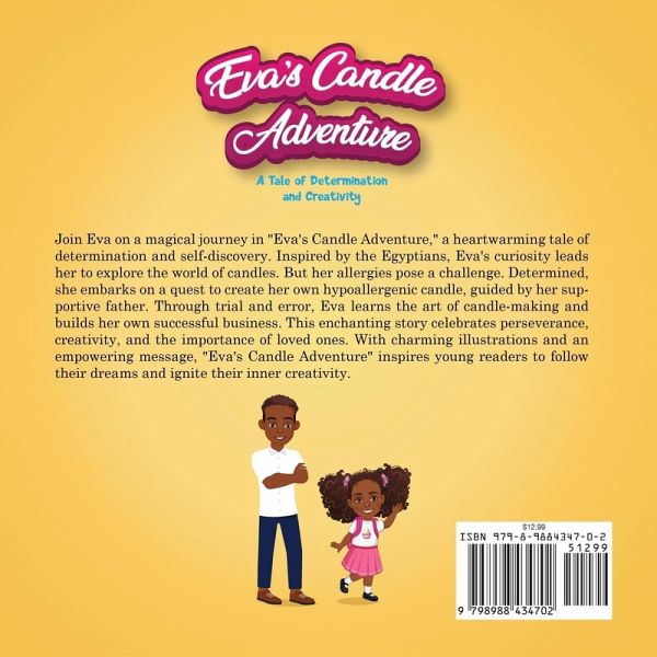 Inspire young readers to pursue their passions and light their inner flame of creativity "Eva's Candle Adventure" is a touching story about a young girl name Eva who is fascinated by the idea of using candles for light, inspired by the ancient Egyptians. Despite her allergies, Eva embarks on a journey to find the perfect candle and, when she can't, instead of giving up she decides to make her own. With the support of her loving father, Eva learns the art of candle making and creates her own successful business, Bella Oshun Candles. This captivating story celebrates determination, creativity, and the power of following one's passion. Join Eva on her journey as she discovers that sometimes the most rewarding path is the one, we create ourselves. "Eva's Candles Adventure" will inspire young readers to pursue their passions and light their inner flame of creativity.