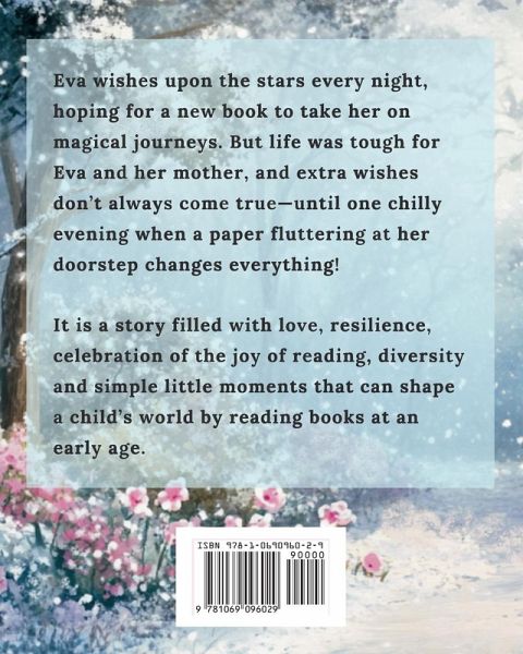 A Heartwarming Story of Hope, Friendship, and Magical Adventures Eva is a thoughtful, kind-hearted little girl who dreams of new adventures and making friends. She wishes upon the stars every night, hoping for a new book to take her on magical journeys. But life is tough for Eva and her mother, and extra wishes don't always come true-until one chilly evening when a paper fluttering at her doorstep changes everything! It is a story filled with love, resilience, celebration of the joy of reading, diversity, and simple little moments that can shape a child's world by reading books at an early age.