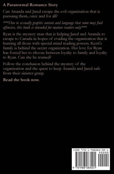 A Paranormal Romance Story Can Ananda and Jared escape the evil organization that is pursuing them, once and for all? ***Due to sexually graphic content and language that some may find offensive, this book is intended for mature readers only*** Ryan is the mystery man that is helping Jared and Ananda to escape to Canada in hopes of evading the organization that is hunting all those with special mind reading powers. Kerri's family is behind the secret organization. Her love for Ryan has forced her to choose between loyalty to family and loyalty to Ryan. Can she be trusted? Follow the conclusion behind the mystery of the organization and the quest to keep Ananda and Jared safe from their sinister grasp. Read the book now.
