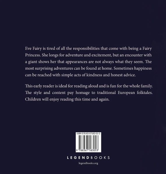 Eve Fairy is tired of all the responsibilities that come with being a Fairy Princess. She longs for adventure and excitement, but an encounter with a giant shows her that appearances are not always what they seem. The most surprising adventures can be found at home. Sometimes happiness can be reached with simple acts of kindness and honest advice. This early reader is ideal for reading aloud and is fun for the whole family. The style and content pay homage to traditional European folktales. Children will enjoy reading this time and again.