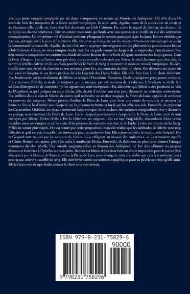 Eve, une jeune vampire complexée par ses dents manquantes, vit recluse au Manoir des Aubépines. Elle rêve d'une vie normale, loin des moqueries de la haute société vampirique. Sa seule amie, Agathe, tente de la convaincre de sortir et de s'accepter telle qu'elle est. Lors d'un bal clandestin au Club Crimson, Eve croise le regard de Bastien, un chasseur de vampires au charme ténébreux. Une rencontre troublante qui bouleverse son quotidien et éveille en elle des sentiments contradictoires. Un mystérieux vol d'artefact survient, plongeant le monde surnaturel dans le chaos. Eve est obsédée par Bastien, partagée entre la peur et l'attirance. Elle découvre qu'il enquête sur les récents événements étranges qui secouent la communauté surnaturelle. Agathe, de son côté, mène sa propre investigation sur des phénomènes paranormaux liés au Club Crimson. Côme, un vieux vampire érudit, met Eve en garde contre les dangers de se rapprocher d'un chasseur. Eve, déterminée à comprendre ses sentiments, décide de suivre Bastien dans la Forêt d'Argent, territoire des loups-garous. Dans la Forêt d'Argent, Eve et Bastien sont pris dans une embuscade orchestrée par Silvère, le chef charismatique d'un clan de vampires rebelles. Silvère révèle ses plans pour briser le Pacte de Sang et instaurer un nouveau monde vampirique. Bastien, tiraillé entre son devoir de chasseur et son attirance pour Eve, est contraint de faire un choix. Eve découvre un secret sur son passé et l'origine de ses dents perdues, lié à la Légende des Dents Volées. Elle doit faire face à un choix déchirant. Eve, bouleversée par les révélations de Silvère, se réfugie à l'Académie Nocturne, l'école prestigieuse pour jeunes vampires. Elle y retrouve Ophélie, sa rivale de toujours, qui ne manque pas une occasion de la rabaisser. L'Académie se révèle être un lieu d'intrigues et de complots, où les apparences sont trompeuses. Eve découvre que Silvère a des partisans au sein de l'Académie et qu'il prépare un coup d'éclat. Elle décide d'infiltrer son clan pour découvrir ses véritables motivations. Eve, infiltrée dans le clan de Silvère, découvre qu'il recherche un artefact magique, la Pierre de Lune, capable de renforcer les pouvoirs des vampires. Silvère prévoit d'utiliser la Pierre de Lune pour lever une armée de vampires et attaquer les humains. Eve se lie d'amitié avec Gaspard, un loup-garou taciturne et loyal, qui lui offre son aide. Ensemble, ils explorent les Catacombes Oubliées, un réseau souterrain labyrinthique où se cachent des créatures marginalisées. Eve y découvre un passage secret menant à la Pierre de Lune. Eve et Gaspard parviennent à s'emparer de la Pierre de Lune, mais ils sont rattrapés par Silvère. Silvère révèle à Eve la vérité sur ses origines : elle est une Sang-Mêlée, descendante d'une union interdite entre un vampire et un humain. Il lui propose de rejoindre son clan et de l'aider à créer un monde où les Sang-Mêlés ne seront plus rejetés. Eve est tentée par cette proposition, mais elle réalise que les méthodes de Silvère sont trop radicales et qu'il est prêt à sacrifier des innocents pour atteindre son but. Elle refuse son offre et s'enfuit avec Gaspard. Eve et Gaspard sont traqués par les vampires de Silvère. Ils se réfugient au Manoir des Aubépines, où ils retrouvent Agathe et Côme. Bastien les rejoint, prêt à les aider à combattre Silvère. Ensemble, ils élaborent un plan pour contrer l'attaque imminente du clan rebelle. Une bataille sanglante éclate au Manoir des Aubépines, où Eve doit affronter ses propres démons et faire face à Ophélie, sa rivale jurée. Bastien est blessé, et Eve doit faire un choix impossible pour le sauver. Eve, désespérée par la blessure de Bastien, utilise la Pierre de Lune pour le soigner, mais elle réalise que cela la transforme peu à peu en une créature assoiffée de sang. Elle doit lutter contre ses instinct