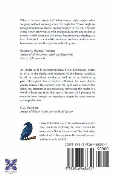 In Eve Was a Realist, a collection of poems written over the last decade, Fiona Robertson invokes the complexities and pains of flesh-and-blood living, while also celebrating moments of awe, revelation, and emergence. She throws off the shackles of anodyne spirituality, and invites us into the depths, where paradox abounds and nothing is quite what it seems on the surface. Robertson's poems emerge from moments of raw, visceral experience, and speak to both the tremulously personal and the breathtakingly universal. Giving voice to the subtleties that often go unheard, her work charts the movements of life's loves and heartbreaks, and the inextricability of one from another. Her poetry affirms and questions, mourns and delights, screams and whispers. Above all, it beckons us towards the possibility of being fully human, and fully here.
