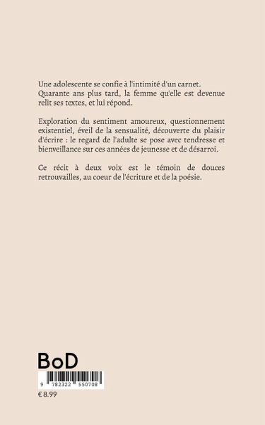 Une adolescente se confie à l'intimité d'un carnet. Quarante ans plus tard, la femme qu'elle est devenue relit ses textes, et lui répond. Exploration du sentiment amoureux, questionnement existentiel, éveil de la sensualité, découverte du plaisir d'écrire : le regard de l'adulte se pose avec tendresse et bienveillance sur ces années de jeunesse et de désarroi. Ce récit à deux voix est le témoin de douces retrouvailles, au coeur de l'écriture et de la poésie.