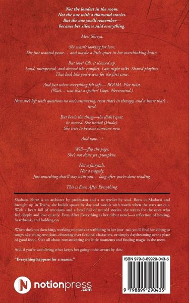 Not the loudest in the room. Not the one with a thousand stories. But the one you'll remember- because her silence said everything. Meet Shreya. She wasn't looking for love. She just wanted peace... and maybe a little quiet in her overthinking brain. But love? Oh, it showed up. Loud, unexpected, and dressed like comfort. Late-night talks. Shared playlists. That look like you're seen for the first time. And just when everything felt safe- BOOM. Plot twist. (Wait... was that a spoiler? Oops. Nevermind.) Now she's left with questions no one's answering, trust that's in therapy, and a heart that's... tired. But here's the thing-she didn't quit. She moved. She healed (kinda). She tries to become someone new. And now...? Well-flip the page. She's not done yet, pumpkin. Not a fairytale. Not a tragedy. Just something that'll stay with you... long after you're done reading. This is Even After Everything.