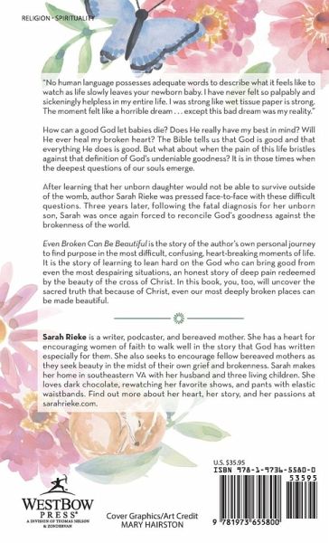 "No human language possesses adequate words to describe what it feels like to watch as life slowly leaves your newborn baby. I have never felt so palpably and sickeningly helpless in my entire life. I was strong like wet tissue paper is strong. The moment felt like a horrible dream . . . except this bad dream was my reality." How can a good God let babies die? Does He really have my best in mind? Will He ever heal my broken heart? The Bible tells us that God is good and that everything He does is good. But what about when the pain of this life bristles against that definition of God's undeniable goodness? It is in those times when the deepest questions of our souls emerge. After learning that her unborn daughter would not be able to survive outside of the womb, author Sarah Rieke was pressed face-to-face with these difficult questions. Three years later, following the fatal diagnosis for her unborn son, Sarah was once again forced to reconcile God's goodness against the brokenness of the world. Even Broken Can Be Beautiful is the story of the author's own personal journey to find purpose in the most difficult, confusing, heart-breaking moments of life. It is the story of learning to lean hard on the God who can bring good from even the most despairing situations, an honest story of deep pain redeemed by the beauty of the cross of Christ. In this book, you, too, will uncover the sacred truth that because of Christ, even our most deeply broken places can be made beautiful.