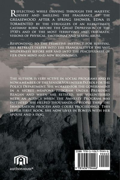 Reflecting while driving through the majestic desert and smelling the fragrance of the greasewood after a spring shower, Edna is tormented by the struggles of an illegitimate castaway born before the Great Depression of the 1930's and of the most terrifying and traumatic visions of physical, emotional and sexual abuse. Responding to the primitive instinct for survival, she retreats deeper into the tranquility of the vast wilderness before her and into the peacefulness of her own mind and new beginnings.