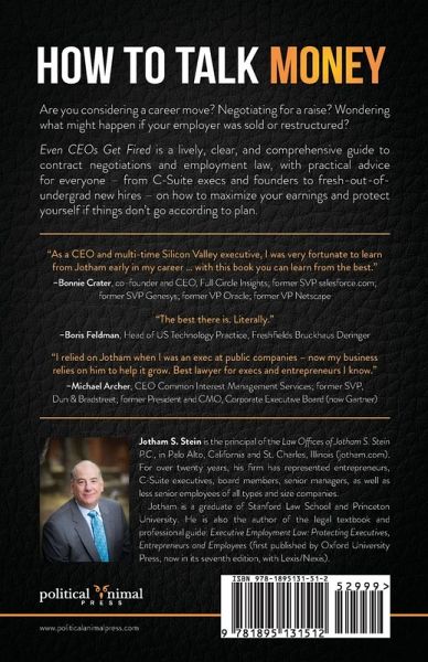 Jotham Stein is a Silicon Valley employment lawyer who represents entrepreneurs, C-Suite executives, board members, and senior managers, as well as less senior employees at companies of every size and type. In Even CEOs Get Fired, Jotham walks readers through the best practices, common pitfalls, and sky's-the-limit possibilities in the various stages of a career - from getting hired, to surviving an employer's changes in control, to a voluntarily exit... to getting fired. Each chapter focuses on a particular issue, mixing straightforward actionable advice with engaging fictional stories, based on real-life scenarios Jotham has seen in his practice. Readers starting out in their careers, or considering jumping into entrepreneurship, will learn how to negotiate like a CEO, regardless of their position. Those already in the C-Suite will appreciate his explanation of which documents and clauses really matter in complex employment agreements, and how to maximize your leverage by focusing on the bottom line. Even CEOs Get Fired is the ultimate guide to talking money, an essential tool for anyone moving up in business.