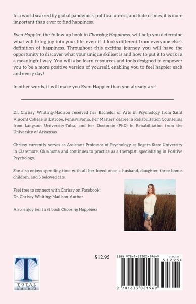 In a world scarred by global pandemics, political unrest, and hate crimes, it is more important than ever to find happiness. Even Happier, the follow up book to Choosing Happiness, will help you determine what will bring joy into your life, even if it looks different from everyone else's definition of happiness. Throughout this exciting journey you will have the opportunity to discover what your unique skillset is and how to put it to work in a meaningful way. You will also learn resources and tools designed to empower you to be a more positive version of yourself, enabling you to feel happier each and every day! In other words, it will make you Even Happier than you already are!