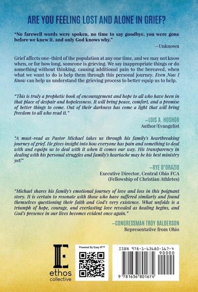 Are you feeling lost and alone in grief? According to the CDC, approximately 1 in 100 pregnancies that survive twenty weeks or longer is affected by stillbirth. Grief can send you into a downward spiral if not held in check. Even Now I Know is a vivid picture of a family of faith navigating through a myriad of emotions, challenges, heartache, and frustration. In it, Dr. Michael Bullock shares his creative perspective on the conversations surrounding the biblical story of Mary, Martha, Lazarus, and Jesus. Through Martha's words to Jesus, we gain perspective about a Lord who can heal us, help us, and honor our progression of climbing out of a dark place and into His gracious arms. When we cannot find answers, only then will we realize Christ is THE Answer. Martha helps us find our way and find hope surrounded by laughter once again. Discover how to: * Heal through past pain so you can create a bigger future * Find joy and laughter so you can experience all the goodness God has to offer * Move from grief to gratitude so you can create positive change in the world Suffering loss does not mean you have to be lost. Although painful, grief and loss can also propel us to find a deeper purpose in life. Let's transition into gratitude together.