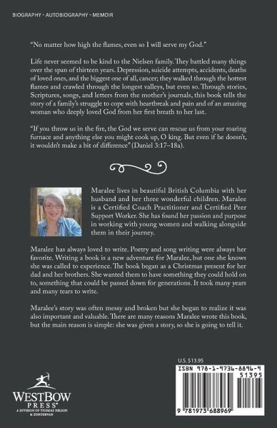 "No matter how high the flames, even so I will serve my God." Life never seemed to be kind to the Nielsen family. They battled many things over the span of thirteen years. Depression, suicide attempts, accidents, deaths of loved ones, and the biggest one of all, cancer; they walked through the hottest flames and crawled through the longest valleys, but even so. Through stories, Scriptures, songs, and letters from the mother's journals, this book tells the story of a family's struggle to cope with heartbreak and pain and of an amazing woman who deeply loved God from her first breath to her…mehr