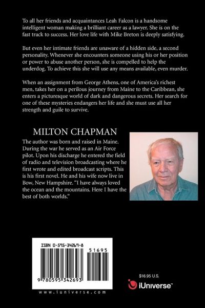 To all her friends and acquaintances Leah Falcon is a handsome intelligent woman making a brilliant career as a lawyer. She is on the fast track to success. Her love life with Mike Breton is deeply satisfying. But even her intimate friends are unaware of a hidden side, a second personality. Whenever she encounters someone using his or her position or power to abuse another person, she is compelled to help the underdog. To achieve this she will use any means available, even murder. When an assignment from George Athens, one of America's richest men, takes her on a perilous journey from Maine to the Caribbean, she enters a picturesque world of dark and dangerous secrets. Her search for one of these mysteries endangers her life and she must use all her strength and guile to survive.