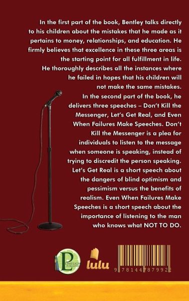 In the first part of the book, Bentley talks directly to his children about the mistakes that he made as it pertains to money, relationships, and education. He firmly believes that excellence in these three areas is the starting point for all fulfillment in life. He thoroughly describes all the instances where he failed in hopes that his children will not make the same mistakes. In the second part of the book, he delivers three speeches - Don't Kill the Messenger, Let's Get Real, and Even When Failures Make Speeches. Don't Kill the Messenger is a plea for individuals to listen to the message when someone is speaking, instead of trying to discredit the person speaking. Let's Get Real is a short speech about the dangers of blind optimism and pessimism versus the benefits of realism. Even When Failures Make Speeches is a short speech about the importance of listening to the man who knows what NOT TO DO.