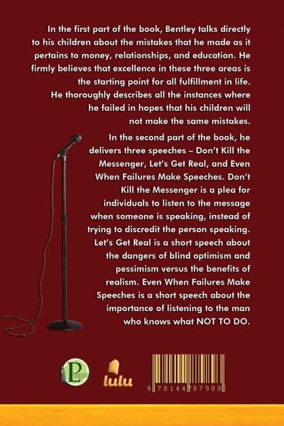 In the first part of the book, Bentley talks directly to his children about the mistakes that he made as it pertains to money, relationships, and education. He firmly believes that excellence in these three areas is the starting point for all fulfillment in life. He thoroughly describes all the instances where he failed in hopes that his children will not make the same mistakes. In the second part of the book, he delivers three speeches - Don't Kill the Messenger, Let's Get Real, and Even When Failures Make Speeches. Don't Kill the Messenger is a plea for individuals to listen to the message when someone is speaking, instead of trying to discredit the person speaking. Let's Get Real is a short speech about the dangers of blind optimism and pessimism versus the benefits of realism. Even When Failures Make Speeches is a short speech about the importance of listening to the man who knows what NOT TO DO.