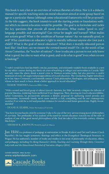 This book is not a list or an overview of various theories of ethics. Nor is it a didactic manual for specific teaching units on moral education aimed at some group based on age or a particular theme (although some educational frameworks will be proposed). As the title suggests, the book intends to seek the starting points or foundations without which no moral education would be possible. The goal is to formulate and tackle the key questions that precede all moral education. What makes "good vs. evil" language possible and meaningful? Can virtue be taught and learned? What makes our actions good? What is the condition of human nature? Are we naturally good, or evil? What constitutes an educator's right to morally influence anyone else (not just a child)? What is the goal of moral education? What does a morally educated person look like? And how can we ensure the coveted moral result? Or--in the words of Jan Amos Comenius, the "teacher of nations"--how to educate a person to not only know what is good, but also to want what is good, and to do what is good "even when no one is looking?"