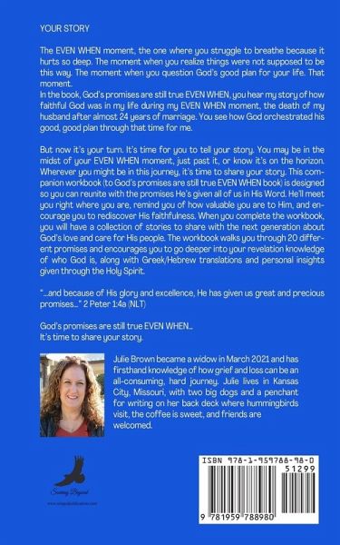 YOUR STORY The EVEN WHEN moment, the one where you struggle to breathe because it hurts so deep. The moment when you realize things were not supposed to be this way. The moment when you question God's good plan for your life. That moment. In the book, God's promises are still true EVEN WHEN, you hear my story of how faithful God was in my life during my EVEN WHEN moment, the death of my husband after almost 24 years of marriage. You see how God orchestrated his good, good plan through that time for me. But now it's your turn. It's time for you to tell your story. You may be in the midst of your EVEN WHEN moment, just past it, or know it's on the horizon. Wherever you might be in this journey, it's time to share your story. This companion workbook (to God's promises are still true EVEN WHEN book) is designed so you can reunite with the promises He's given all of us in His Word. He'll meet you right where you are, remind you of how valuable you are to Him, and encourage you to rediscover His faithfulness. When you complete the workbook, you will have a collection of stories to share with the next generation about God's love and care for His people. The workbook walks you through 20 different promises and encourages you to go deeper into your revelation knowledge of who God is, along with Greek/Hebrew translations and personal insights given through the Holy Spirit. "...and because of His glory and excellence, He has given us great and precious promises..." 2 Peter 1:4a (NLT) God's promises are still true EVEN WHEN... It's time to share your story.