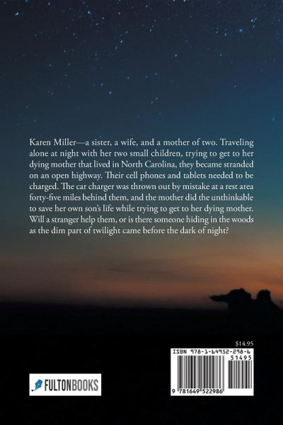 Karen Miller-a sister, a wife, and a mother of two. Traveling alone at night with her two small children, trying to get to her dying mother that lived in North Carolina, they became stranded on an open highway. Their cell phones and tablets needed to be charged. The car charger was thrown out by mistake at a rest area forty-five miles behind them, and the mother did the unthinkable to save her own son's life while trying to get to her dying mother. Will a stranger help them, or is there someone hiding in the woods as the dim part of twilight came before the dark of night?