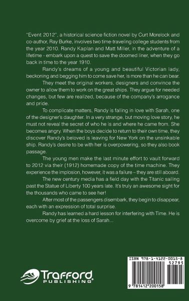 "Event 2012", a historical science fiction novel by Curt Morelock and co-author, Ray Burke, involves two time-traveling college students from the year 2010. Randy Kaplan and Matt Miller, in the adventure of a lifetime - embark upon a quest to save the doomed liner, when they go back in time to the year 1910. Randy's dreams of a young and beautiful Victorian lady, beckoning and begging him to come save her, is more than he can bear. They meet the original workers, designers and convince the owner to allow them to work on the great ships. They argue for needed changes, but few are realized, because of the company's arrogance and pride. To complicate matters, Randy is falling in love with Sarah, one of the designer's daughter. In a very strange, but moving love story, he must not reveal the secret of who he is and where he came from. She becomes angry. When the boys decide to return to their own time, they discover Randy's beloved is leaving for New York on the unsinkable ship. Randy's desire to be with her is overpowering, so they also book passage. The young men make the last minute effort to vault forward to 2012 via their (1912) homemade copy of the time machine. They experience the implosion, however, it was a failure - they are still aboard. The new century media has a field day with the Titanic sailing past the Statue of Liberty 100 years late. It's truly an awesome sight for the thousands who came to see her! After most of the passengers disembark, they begin to disappear, each with an expression of total surprise. Randy has learned a hard lesson for interfering with Time. He is overcome by grief at the loss of Sarah...