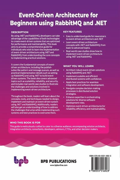 The key to event-driven architecture: A beginner's journey with RabbitMQ and .NET ¿DESCRIPTION By using .NET and RabbitMQ, developers can take advantage of the capabilities of both technologies to create event-driven systems that are optimized for performance and maintainability. This book aims to provide a comprehensive guide for individuals who wish to learn the implementation of event-driven architecture using .NET and RabbitMQ, from understanding the core concepts to implementing practical solutions. It covers the fundamental concepts of event-driven architecture, including the publish-subscribe pattern and message queues, as well as practical implementation details such as setting up RabbitMQ and using .NET to build event-driven systems. The book also covers advanced topics such as scalability, reliability, and security, and includes real-world case studies to illustrate the challenges and solutions involved in implementing event-driven architecture. Throughout the book, readers will learn about the concepts, tools, and techniques needed to design, implement and maintain an event-driven system using .NET and RabbitMQ. Additionally, readers will also get an understanding of how to address the challenges that arise while implementing such systems and best practices to overcome them. WHAT YOU WILL LEARN ¿ Architect robust event-driven solutions using RabbitMQ and .NET. ¿ Implement scalable and efficient distributed systems with confidence. ¿ Apply best practices for seamless integration and software development. ¿ Navigate complex decision-making processes in distributed solution strategies. ¿ Enhance expertise in orchestrating solutions for diverse software development roles. WHO THIS BOOK IS FOR This guide is meticulously crafted to cater to a diverse audience, encompassing solution architects, integration architects, consultants, developers, advisors, CTOs, and other decision-makers.
