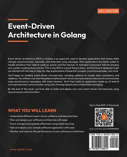 Begin building event-driven microservices, including patterns to handle data consistency and resiliency Key Features: - Explore the benefits and tradeoffs of event-driven architectures with practical examples and use cases - Understand synergy with event sourcing, CQRS, and domain-driven development in software architecture - Build an end-to-end robust application architecture by the end of the book Book Description: Event-driven architecture in Golang is an approach used to develop applications that shares state changes asynchronously, internally, and externally using messages. EDA applications are better suited at handling situations that need to scale up quickly and the chances of individual component failures are less likely to bring your system crashing down. This is why EDA is a great thing to learn and this book is designed to get you started with the help of step-by-step explanations of essential concepts, practical examples, and more. You'll begin building event-driven microservices, including patterns to handle data consistency and resiliency. Not only will you learn the patterns behind event-driven microservices but also how to communicate using asynchronous messaging with event streams. You'll then build an application made of several microservices that communicates using both choreographed and orchestrated messaging. By the end of this book, you'll be able to build and deploy your own event-driven microservices using asynchronous communication. What You Will Learn: - Understand different event-driven patterns and best practices - Plan and design your software architecture with ease - Track changes and updates effectively using event sourcing - Test and deploy your sample software application with ease - Monitor and improve the performance of your software architecture Who this book is for: This hands-on book is for intermediate-level software architects, or senior software engineers working with Golang and interested in building asynchronous microservices using event sourcing, CQRS, and DDD. Intermediate-level knowledge of the Go syntax and concurrency features is necessary. Table of Contents - Introduction to Event-Driven Architectures - Supporting Patterns In Brief - Design and Planning - Event Foundations - Tracking Changes with Event Sourcing - Asynchronous Connections - Event-carried State Transfer - Event Workflows - Transactional Messaging - Testing - Deploying applications to the cloud - Monitoring and Observability