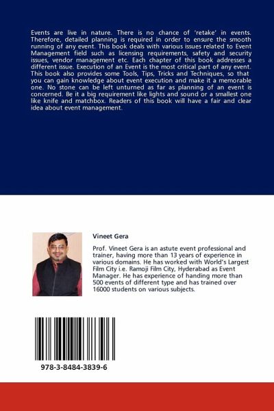 Events are live in nature. There is no chance of retake in events. Therefore, detailed planning is required in order to ensure the smooth running of any event. This book deals with various issues related to Event Management field such as licensing requirements, safety and security issues, vendor management etc. Each chapter of this book addresses a different issue. Execution of an Event is the most critical part of any event. This book also provides some Tools, Tips, Tricks and Techniques, so that you can gain knowledge about event execution and make it a memorable one. No stone can be left unturned as far as planning of an event is concerned. Be it a big requirement like lights and sound or a smallest one like knife and matchbox. Readers of this book will have a fair and clear idea about event management.