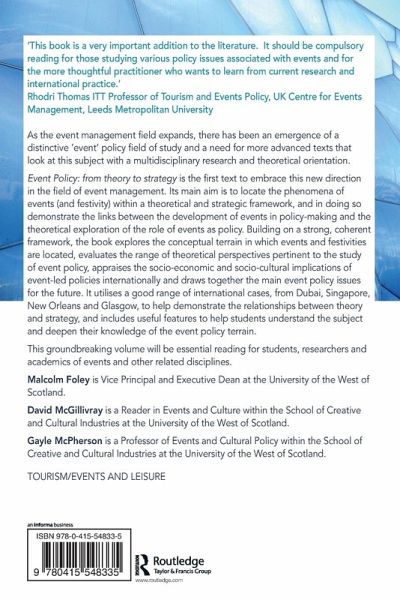 As the event management field expands, there has been an emergence of a distinctive 'events' policy field of study and a need for more advanced texts that look at this subject with a multidisciplinary research and theoretical orientation. Events Policy: From Theory to Strategy is the first text to embrace this new direction in the field of events management. Its main aim is to locate the phenomena of events (and festivity) within a theoretical and strategic framework and, in doing so, demonstrate the links between the development of events in policy-making and the theoretical exploration of the role of events as policy. Building on a strong coherent framework, the book explores the conceptual terrain in which events and festivities are located, evaluates the range of theoretical perspectives pertinent to the study of events policy, appraises the socio-economic and socio-cultural implications of event-led policies internationally and draws together the main theoretical and event policy issues for the future. It utilizes a good range of international cases, from Dubai, Singapore, New Orleans and Glasgow, to help demonstrate the relationships between theory and strategy, and includes useful features to help students understand the subject and deepen their knowledge of the events policy terrain. This groundbreaking volume will be essential reading for students, researchers and academics of events and other related disciplines.