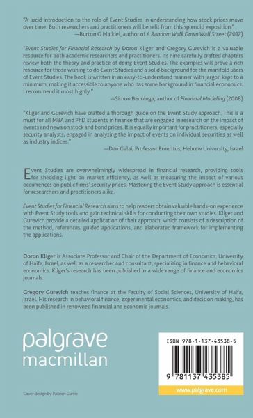 Event Studies are overwhelmingly widespread in financial research, providing tools for shedding light on market efficiency, as well as measuring the impact of various occurrences on public firms' security prices. Mastering the Event Study approach is essential for researchers and practitioners alike.Event Studies for Financial Research aims to help readers obtain valuable hands-on experience with Event Study tools and gain technical skills for conducting their own studies. Kliger and Gurevich provide a detailed application of their approach, which consists of: a description of the method; references; guided applications; and elaborated framework for implementing the applications.