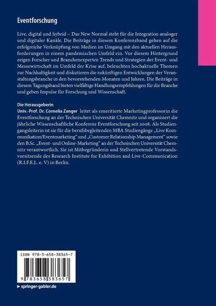 "ZÄHL DAZU".- Next Level Marketing.- BOCOM.- Wie funktionieren Messen und Veranstaltungen in fünf Jahren?; Messestand der Zukunft.- Die RECHTLICHE Normalität bei anlogen, hybriden und digitalen Events.- Digitale Konferenzformate.- Sind digitale Events per se nachhaltiger...oder worauf kommt es an? - Status der Wissensvermittlung zum Thema Nachhaltigkeit in Eventmanagement-Studiengängen an Hochschulen in Deutschland und deren Notwendigkeit für die Beratungskompetenzen im Eventmanagement.- Digitale und hybride Events als Chance für Erwachsenenbildung.- Quo Vadis.- S.A.F.E.- Nach der Krise ist vor der Krise.- Neue Möglichkeiten zur Bewältigung von Verlusterfahrungen durch app-basierte Co-Creation Prozesse.- Bedeutung von Destinationen in der Live-Kommunikation.- Quo vadis MICE- und Tourismus-Destinationen in Deutschland post Corona.