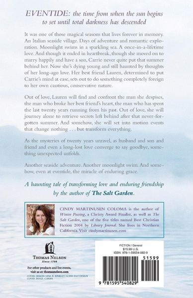 Eventide: the time from when the sun begins to set until total darkness has descended. It was once of those magical seasons that lives forever in memory. An Italian seaside village. Days of adventure and romantic exploration. Moonlight swims in a sparkling sea. A once-in-a-lifetime love. And though it ended in heartbreak, though she moved on to marry happily and have a son, Carrie never quite put that summer behind her. Now she's dying young and still haunted by thoughts of her long-ago love. Her best friend Lauren, determined to put Carrie's mind at ease, sets out to do something completely foreign to her own cautious, conservative nature. Out of love, Lauren will find and confront the man she despises, the man who broke her best friend's heart, the man who has spent the last twenty years running from his past. Out of love, she will journey alone to retrieve secrets left behind after that never-for-gotten summer. And somehow, she will set into motion events that change nothing . . . but transform everything. As the mysteries of twenty years unravel, as husband and son and friend and even a long-lost love converge to say goodbye, something unexpected unfolds. Another seaside adventure. Another moonlight swim. And somethow, even at eventide, the miracle of enduring grace.