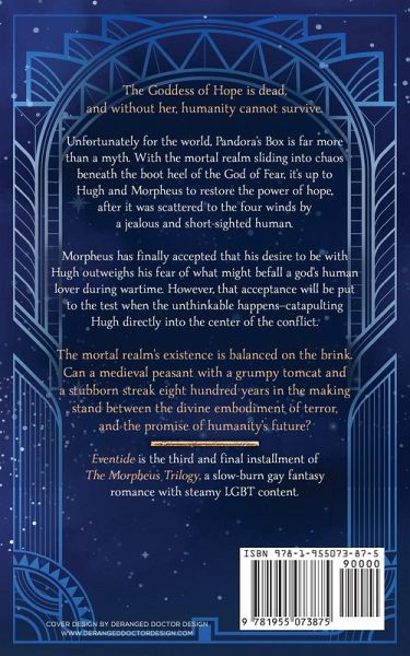 The Goddess of Hope is dead. Without her, humanity cannot survive. Unfortunately for the world, Pandora's Box is far more than a myth. With the mortal realm sliding into chaos beneath the boot heel of the God of Fear, it's up to Hugh and Morpheus to restore the power of hope, after it was scattered to the four winds by a jealous and short-sighted human. Morpheus has finally accepted that his desire to be with Hugh outweighs his fear of what might befall a god's human lover during wartime. However, that acceptance will be put to the test when the unthinkable happens-catapulting Hugh directly into the center of the conflict. The mortal realm's existence is balanced on the brink. Can a medieval peasant with a grumpy tomcat and a stubborn streak eight hundred years in the making stand between the divine embodiment of terror, and the promise of humanity's future? * * * Eventide is the third and final installment of The Morpheus Trilogy, a slow-burn gay fantasy romance with steamy LGBT content.
