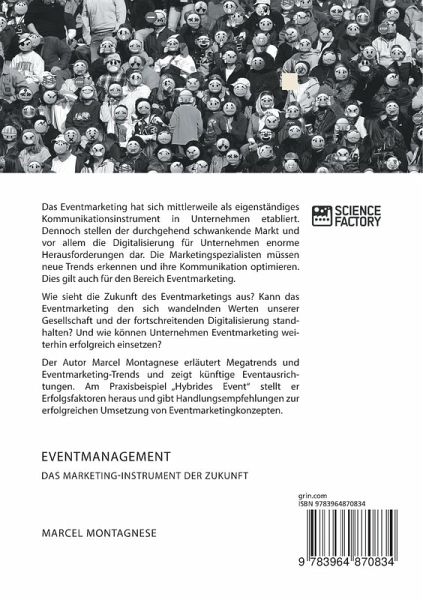 Das Eventmarketing hat sich mittlerweile als eigenständiges Kommunikationsinstrument in Unternehmen etabliert. Dennoch stellen der durchgehend schwankende Markt und vor allem die Digitalisierung für Unternehmen enorme Herausforderungen dar. Die Marketingspezialisten müssen neue Trends erkennen und ihre Kommunikation optimieren. Dies gilt auch für den Bereich Eventmarketing.Wie sieht die Zukunft des Eventmarketings aus? Kann das Eventmarketing den sich wandelnden Werten unserer Gesellschaft und der fortschreitenden Digitalisierung standhalten? Und wie können Unternehmen Eventmarketing weiterhin erfolgreich einsetzen?Der Autor Marcel Montagnese erläutert Megatrends und Eventmarketing-Trends und zeigt künftige Eventausrichtungen. Am Praxisbeispiel "Hybrides Event" stellt er Erfolgsfaktoren heraus und gibt Handlungsempfehlungen zur erfolgreichen Umsetzung von Eventmarketingkonzepten.Aus dem Inhalt:- Social Media;- Marketing-Mix;- Public Relation;- Individualisierung;- Kommunikationspolitik